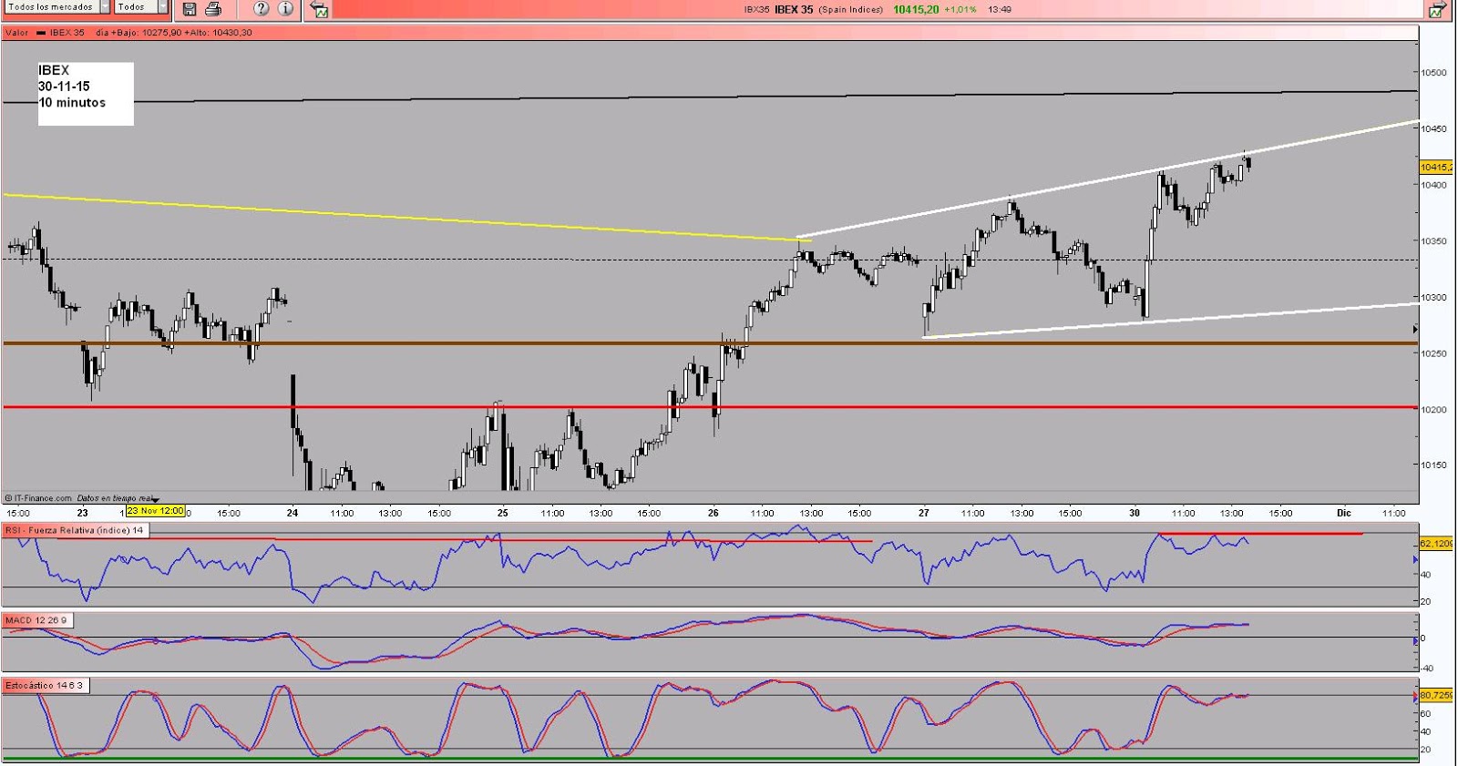 Se apoya y rebota con volumen y fuerza, la resistencia corresponde al 400 del Ibex, los 10250 soporte del Ibex han servido de apoyo.
