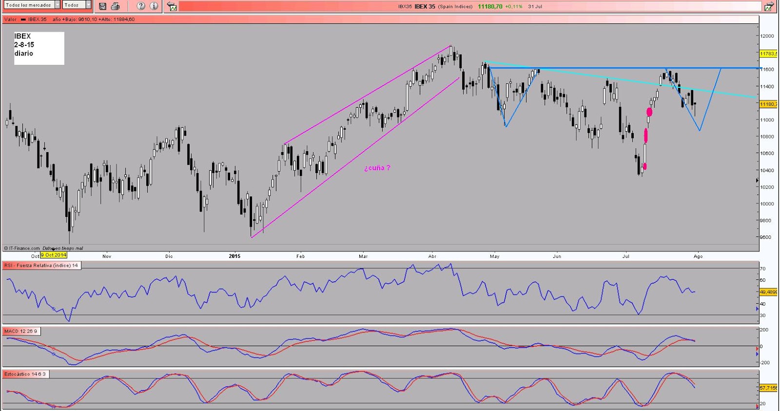 Diario,esas cinco lineas marcan perfectamente soportes y resistencias,indicadores bajistas y si miramos la última vela es un martillo a falta de confirmar el Lunes o Martes.