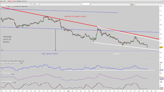 La cuña que he subido a la mañana no ha parado el precio ni ha dado opción de entrada,ha seguido bajando hasta alcanzar el objetivo del canal,la bajista en diario pesa demasiado sobre el precio, a no ser que se de la vuelta en lo que queda hasta el cierre toca seguir esperando mejor ocasión.