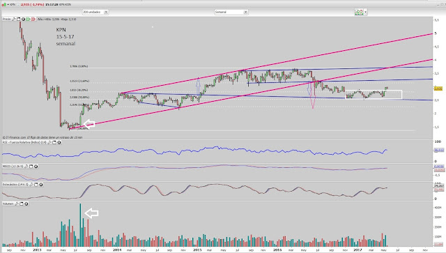 En mensual sin dividendos se ven bien las figuras ( linea verde clavicular de un hch ) y lo que espero es que repita la jugada de lo pintado en azul claro, el macd - estocástico están alcistas, falta que el rsi supere su bajista para dar el empujón al precio pero si pierde los mínimos mal asunto ( pueden engañar con la rotura y salir al alza ).