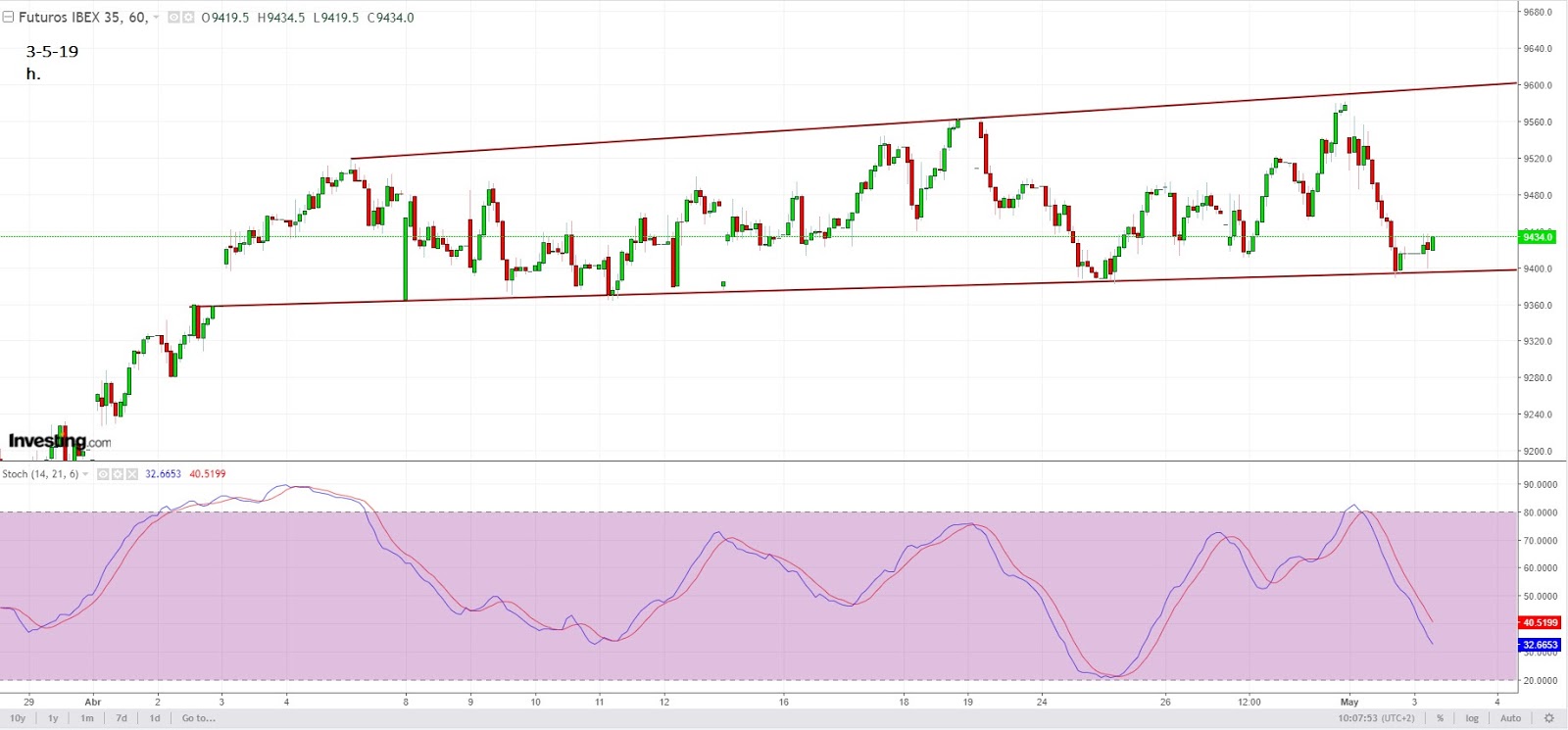 Si se ha seguido o se mira el seguimiento ya sabemos que la linea donde ha rebotado la tenemos hace unos cuantos días y sigue haciendo su trabajo, he esperado al cruce del estocástico en 15 minutos, este es en horario y aun no está cruzado al alza, estaré atento por si hay que entrar de nuevo.