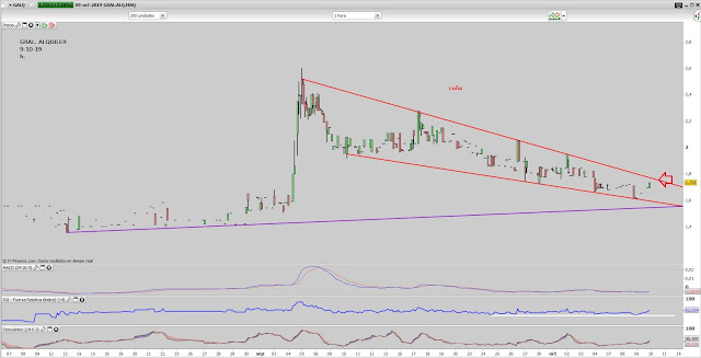Desde Julio la subida forma una figura de cuña que en caso de romper por abajo daría salida, ahora está en la parte alta de la figura pero sin dar salida, es mas, hoy el ri intenta superar su bajista y las divergencias ( tiene que confirmar al cierre ). Pero por si acaso da salida hay que vigilar en plazos cortos.