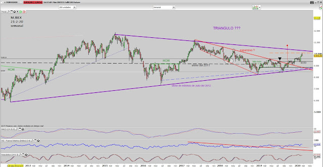 Voy a cambiar la foto del blog, seguimos con el objetivo por el expansivo y como resistencia la bajista que es la parte alta del triángulo. Acabo de subir una pregunta sobre el Ibex ( ¿ donde se ha dado la vuelta exactamente ). .... creo que quien sigue el blog ya debe saberlo viendo este gráfico.