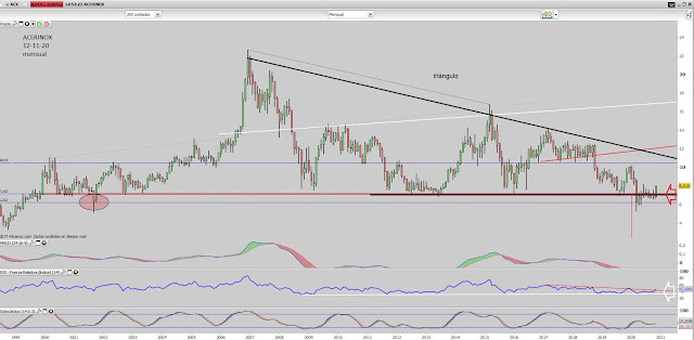 Teníamos la cuña que seguía que activó al alza pero se nos dio la vuelta a la baja para " anularla " y formar el canal rojo, el rsi seguía dando divergencias y vino el rebote 22 %, tiene activado objetivo alcista por el canal y ya vemos las resistencias, yo mientras el Ibex no supere sus resistencias no me arriesgaría.