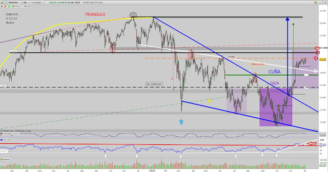 Diario, objetivo alcista pero no olvidemos que tenemos aun el HCH que no está anulado. Parada en máximos anteriores que coincide con el 61,8% de la bajada desde máximos. Rsi en punto donde tiene que decidirse.