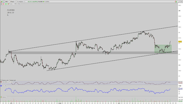 Quien lleve siguiendo el valor desde hace tiempo ya sabe que la zona de los tres euros era obligada, la segunda entrada nos la ha dio ayer al superar la primera línea azul ( clavicular de un HCHI ) y la tercera y stop nos la está dando ahora aunque aun no está confirmada ( eso ya depende del riesgo que cada uno-a quiera tomar ) el stop es el mismo, se podría poner en la roja pero yo lo ajustaría.