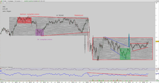 Y aun le quedan. Cumplidos en diario los dos de las tazas de mínimos ( todos los hemos ido siguiendo en su formación y activación ) el del HCHI de mínimos ( los tres con claviculares en verde ), el del triángulo rojo que acaba de cumplirse y nos falta el del canal rojo que está un pelín por encima pero ya vemos donde está el precio.