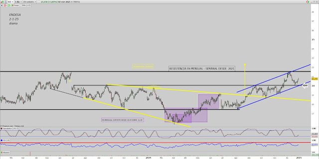 Nos vamos al diario directamente, en mensual y semanal es la misma resistencia que en diario, el objetivo lo sigue marcando el expansivo amarillo y el precio sube dentro del canal azul, eso si, rsi sigue dando divergencias..