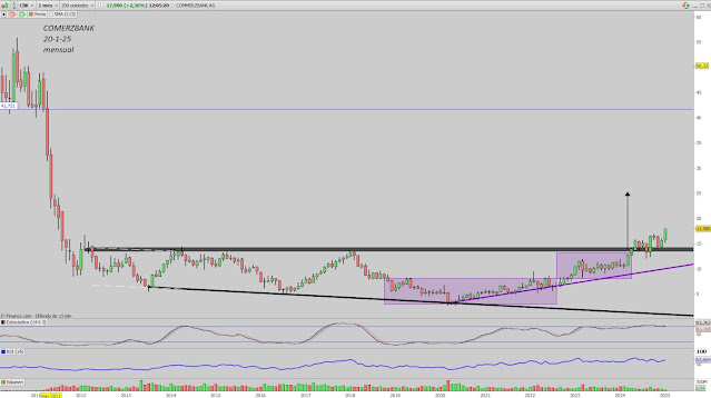 Precio en el techo del canal azul y activando la cuña amarilla al alza. Hoy será presidente Trump así que ojo estos días. Hemos visto en Estoxx 50 fut. y Estoxxbanks la rotura de la resistencia del 2024, en este vemos como la rompió hace tiempo.